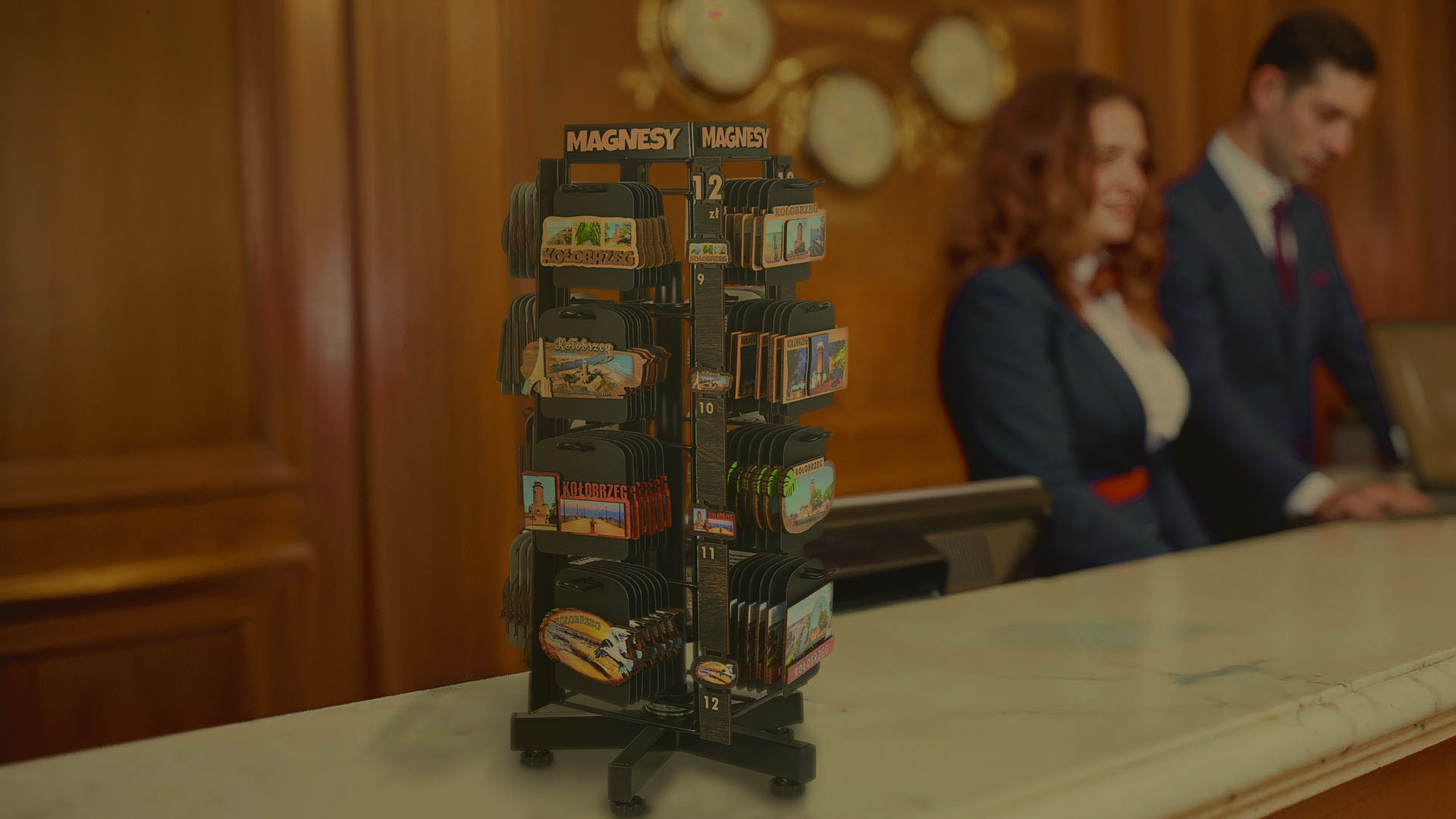 Para la serie hotelera hemos diseñado un nuevo expositor ligero y elegante que ocupa poco espacio y al mismo tiempo decora la recepción del hotel. Su diseño moderno, alta calidad y estilo refinado hacen que la exposición de imanes se convierta en una parte integral del interior del hotel.