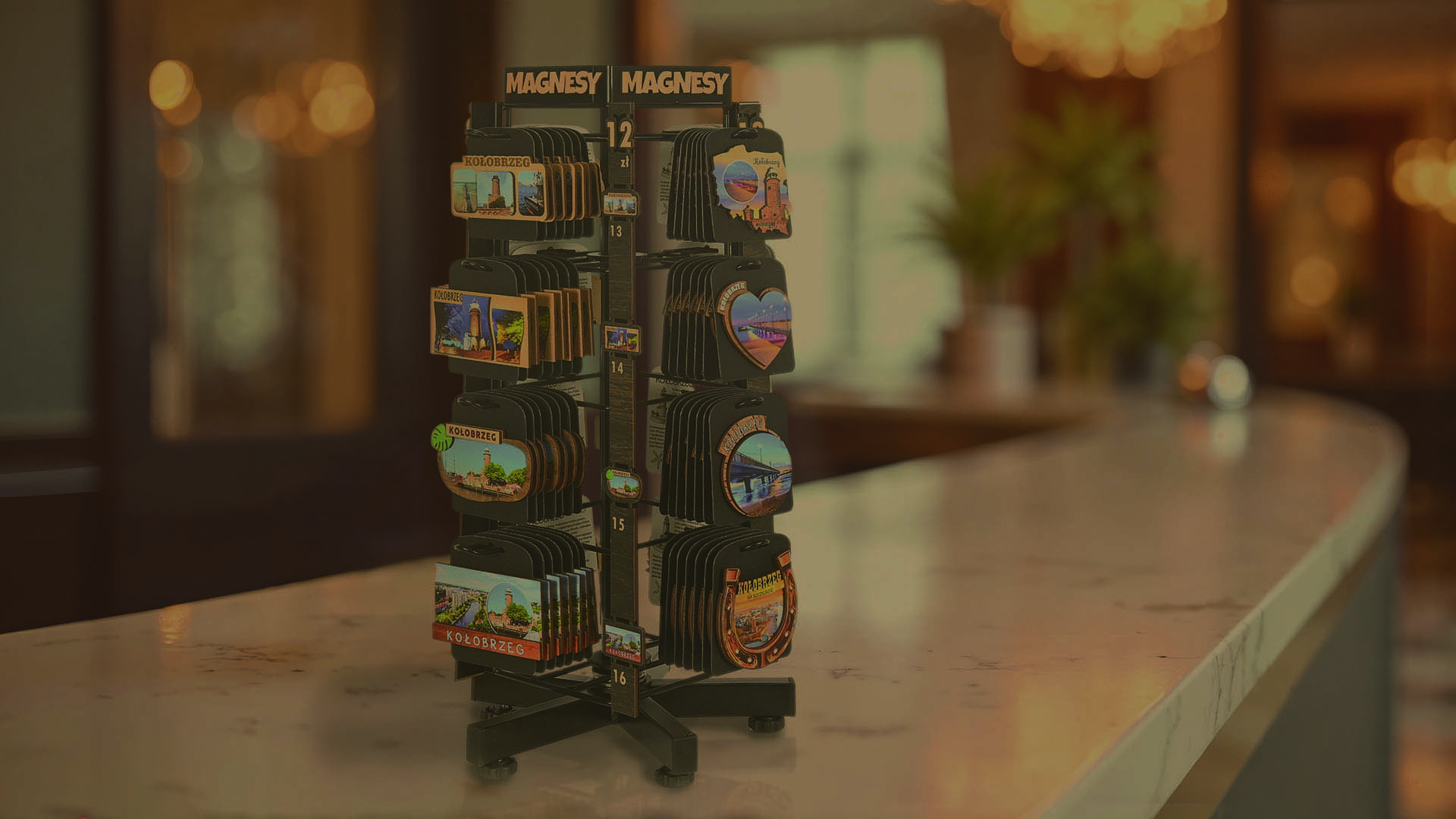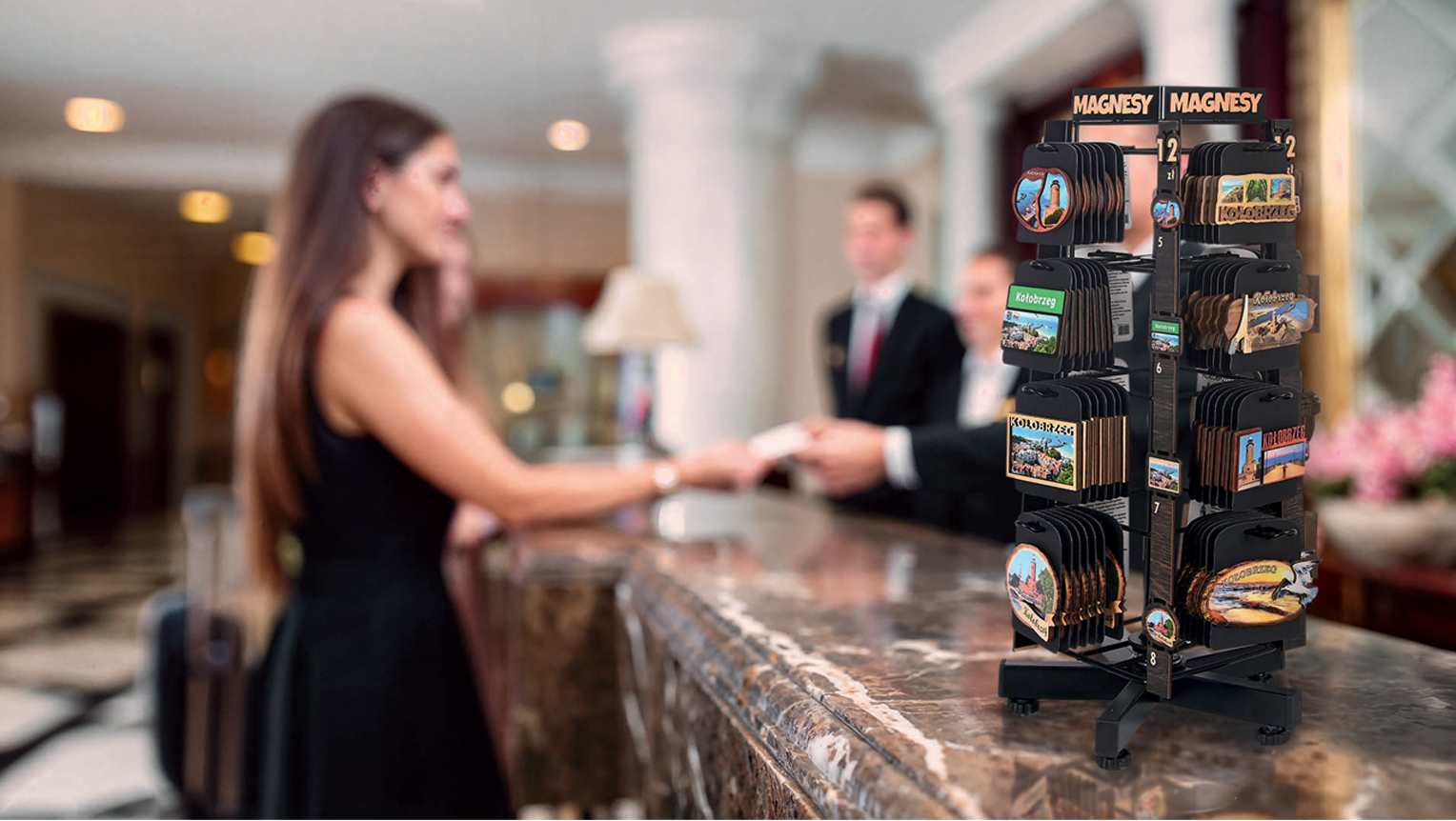 Para la serie hotelera hemos diseñado un nuevo expositor ligero y elegante que ocupa poco espacio y al mismo tiempo decora la recepción del hotel. Su diseño moderno, alta calidad y estilo refinado hacen que la exposición de imanes se convierta en una parte integral del interior del hotel.