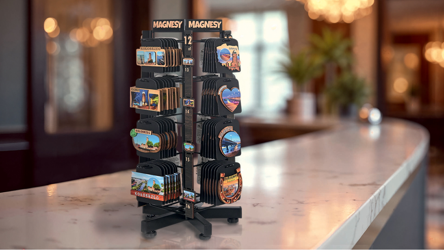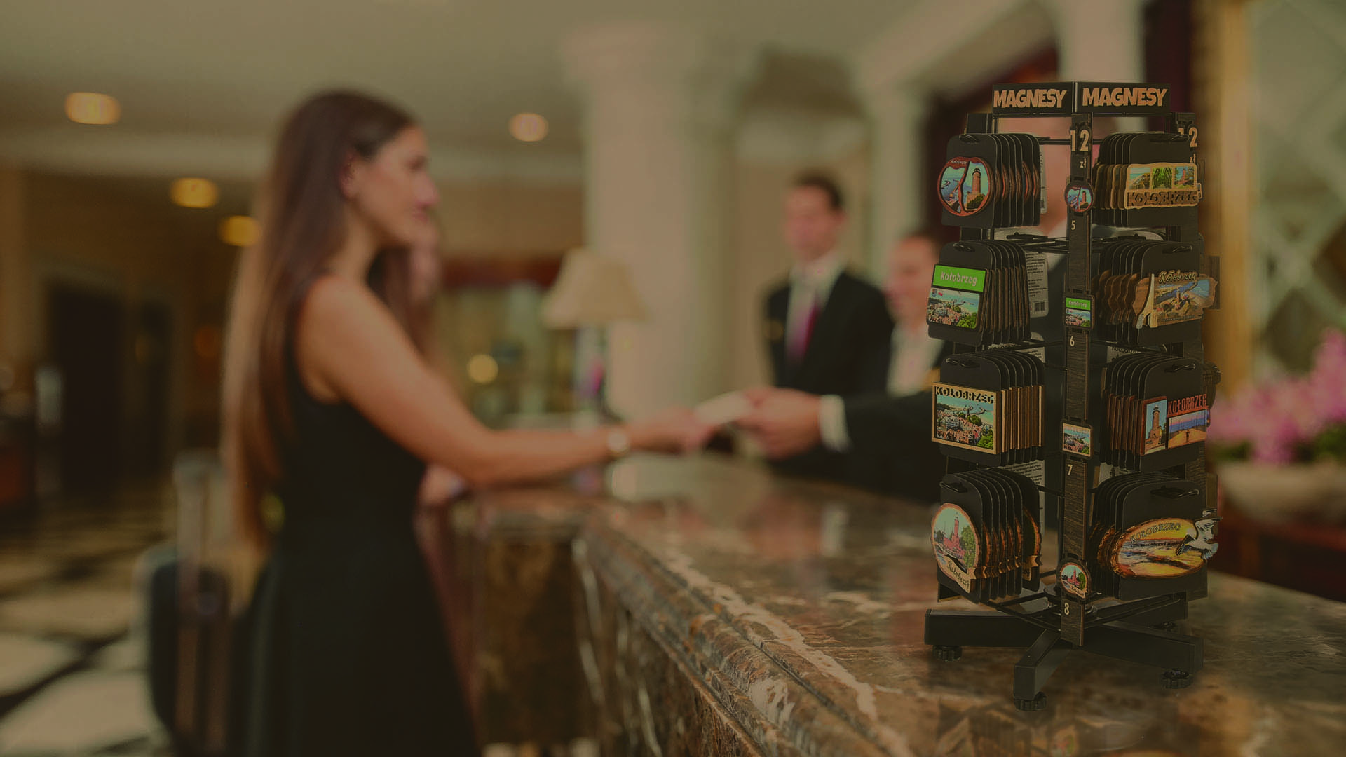 Para la serie hotelera hemos diseñado un nuevo expositor ligero y elegante que ocupa poco espacio y al mismo tiempo decora la recepción del hotel. Su diseño moderno, alta calidad y estilo refinado hacen que la exposición de imanes se convierta en una parte integral del interior del hotel.